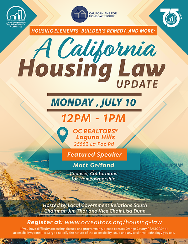10 Jul Housing Elements, Builder's Remedy, and More: A California Housing Law Update Housing Elements, Builder's Remedy, and More: A California Housing Law Update Monday, July 10, 2023 (12:00 PM to 1:00 PM) OC REALTORS® Laguna Hills Details You're Registered! DescriptionLocation OC REALTORS® Laguna Hills 25552 La Paz RoadLaguna Hills, CA 92653 Map & Directions
